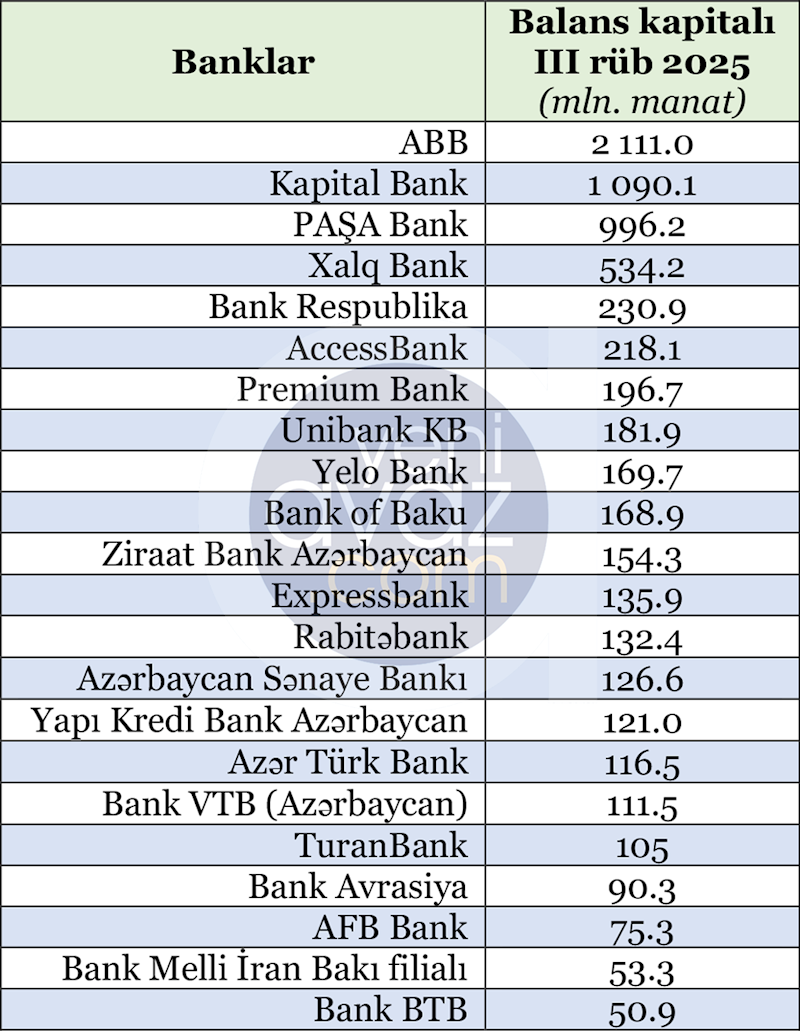 Dövlət bankı olan ABB-nin balans kapitalı 2 milyard 111 milyon manat, “Kapital Bank”ın balans kapitalı isə 1 milyard 90,1 milyon manat təşkil edib.