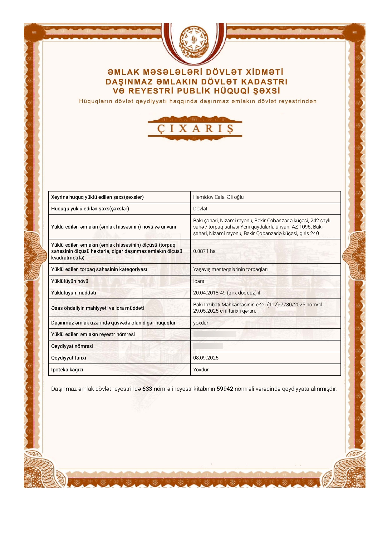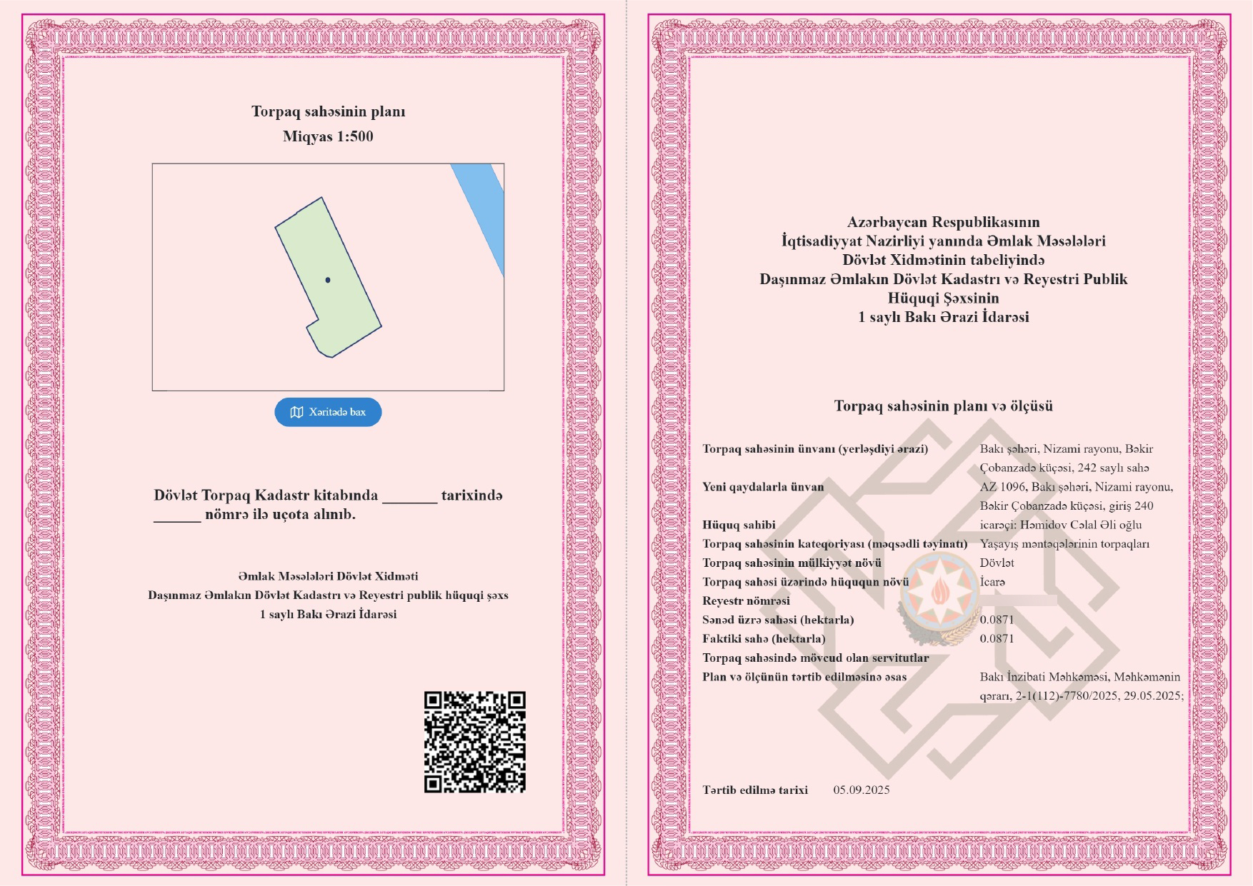 Belə bir vaxtda Cəlal Həmidovun qəyyumu Tamara Həmidova artıq Nizami Rayon İcra Hakimiyyətini rəsmi xəbərdar edərək, həmin strateji boruların üstündə tikinti işlərinə başlayacağını bəyan edib. Daha bir müəmmalı məqam isə torpağın təyinatının “sehrli əl” vasitəsilə dəyişdirilməsidir. Əvvəllər sənaye, nəqliyyat və rabitə təyinatlı olan bu torpaqlar, hansısa yollarla sənədlərdə “yaşayış məntəqələrinin torpaqları” kimi rəsmiləşdirilib. İndi isə bu elan saytlarında 1 milyon 300 min manata satışa çıxarılıb. Alıcılara isə bura fərdi yaşayış evi tikmək üçün ideal yer kimi sırınır. Magistral su kəmərinin və ya kollektorun üzərində ev tikmək, hər an partlaya biləcək bombanın üzərində oturmaqdır.
