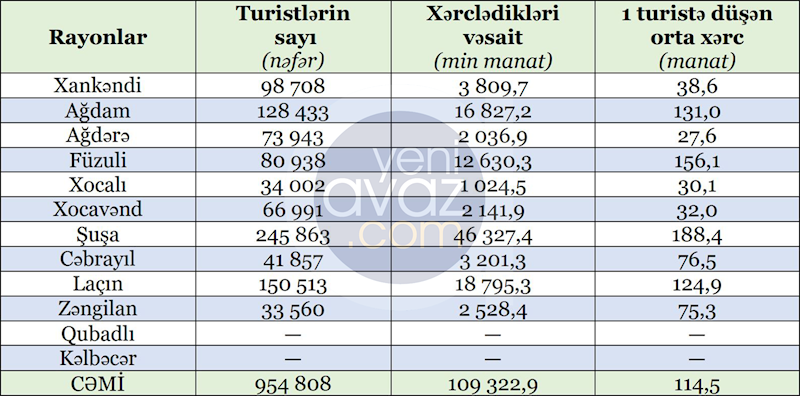 Qeyd edək ki, işğaldan azad olunan rayonlara səfər edən turistlər ümumilikdə 109 milyon 322,9 min manat xərcləyiblər. Turistlərin ən çox Şuşada, ən az isə Ağdərədə xərcləri çıxıb. Şuşada adambaşına düşən xərc 188,4 manat, Ağdərədə isə 27,6 manat olub.