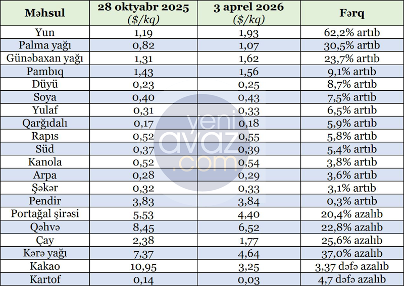 Son 5 ayda dünyada ərzaq qiymətləri necə dəyişib? - SİYAHI