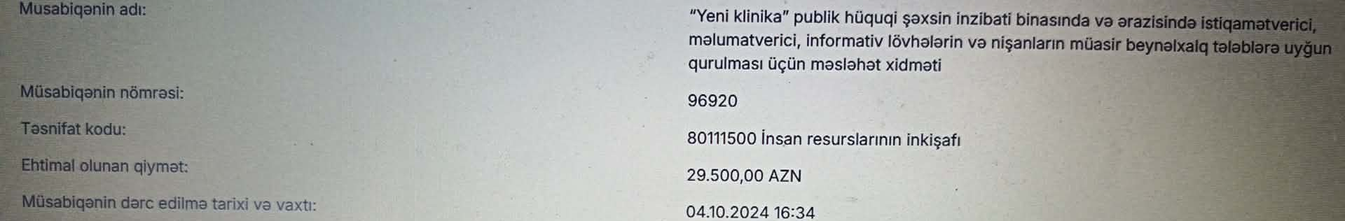 "Yeni Klinika" 2024-cü ilin noyabr ayının 19-da ""Yeni klinika” publik hüquqi şəxsin inzibati binasında və ərazisində istiqamətverici, məlumatverici, informativ lövhələrin və nişanların müasir beynəlxalq tələblərə uyğun qurulması üçün məsləhət xidməti" lotu üzrə sifarişçi olduğu satınalmaya yekun vurub.