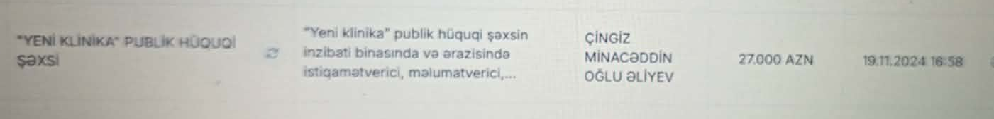 Qlobal.az xəbər verir ki, bu satınalmanın məbləği 27.000 manat, qalib isə Əliyev Çingiz Minacəddin oğlu olub.