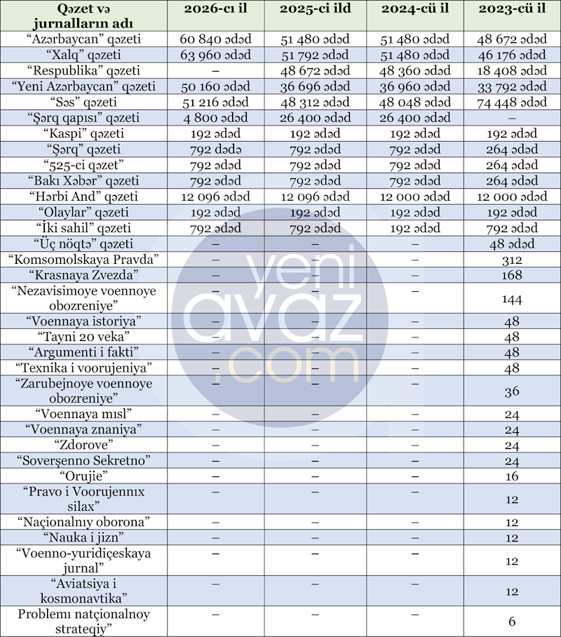 Qalib şirkət 2026-cı il ərzində Müdafiə Nazirliyinə 12 adda qəzet satacaq və qarşılığıda 156 min 889 manat 92 qəpik alacaq.