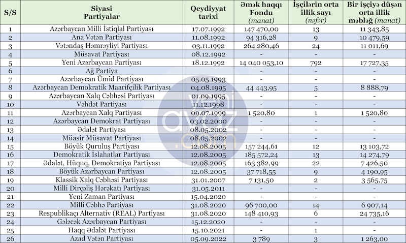 Siyasi partiyaların 2025-ci ildəki əməkhaqqı fondu, işçi sayı və bir işçiyə düşən orta illik əməkhaqqı məbləği cədvəldə göstərilib: