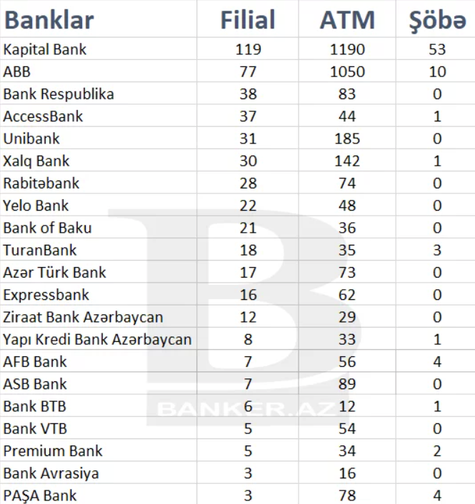 Qeyd edək ki, hazırda Azərbaycanda 22 bank fəaliyyət göstərir. Xidmət şəbəkəsinin genişliyi istiqamətində isə liderlik Kapital Bankdadır. Bankın ölkə üzrə 119 filialı, 53 şöbəsi və 1190 bankomatı var. Bu göstərici ilə Kapital Bank maliyyə sektorunda birinci yeri tutur. Eyni zamanda ölkənin hər yerində müştəriyə ən yaxın bank imicini möhkəmləndirir. Siyahıda maliyyə sektorunun əsas simalarından biri olan ABB 77 filial, 10 şöbə və 1050 bankomatla 2-ci, Bank Respublika isə 38 filial, 83 ATM ilə 3-cü yerdə qərarlaşır.