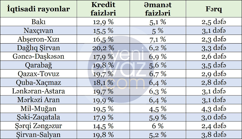 Məlumatlar göstərir ki, bütün iqtisadi rayonlarda kredit faizləri əmanət faizlərini dəfələrlə üstələyir. Kredit və əmanət faizləri arasındakı ən böyük fərq Mil-Muğan iqtisadi rayonunda qeydə alınıb – burada kredit faizləri əmanət faizlərini 4,3 dəfə üstələyir.